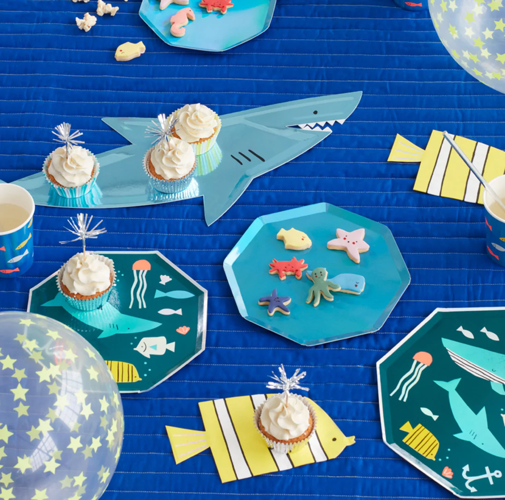 Thrill your guests by turning the party table into a sea of shimmering sharks with these sensational plates!